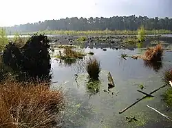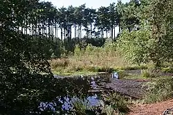 Two Sites of Special Scientific Interest (SSSIs) lie within the area of Delamere Forest owned by the Forestry Commission. Black Lake (SJ537709) is an example of the rare quaking bog or schwingmoor habitat, a type of bog in which bog vegetation forms a raft which floats on top of water. The site is particularly notable for including the very earliest stages in quaking bog development, although all stages are present, from open water to largely consolidated schwingmoor in the process of colonisation by Scots pine. In addition to Sphagnum species, common sundew and the locally rare white sedge are present. The site is managed by Cheshire Wildlife Trust and forms part of the Midland Meres and Mosses Ramsar site.[35][36]
