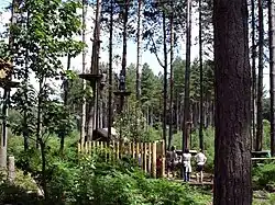 Other activities include horse riding, jogging, orienteering, bird watching and nature study.[20][44] Britain's largest Go Ape facility opened in Delamere Forest in 2006; it includes numerous zip wires, Tarzan swings, tightropes and nets high in the treetops.[26][45] Delamere Forest is the venue for the northern Hellrunner cross-country race, and the Sandstone Trail Race finishes in the forest.[46][47] A parkrun takes place weekly on Saturdays; the course is one loop of Blakemere Moss on the forest's trails.[48]