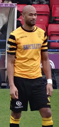 He returned to Cambridge United, scoring in his first game back at the club in a comprehensive 5–1 victory over Kidderminster Harriers on 1 March 2014.[19] He is considered a cult hero at Cambridge after helping the club to the Conference Premier play-offs by scoring twice in a 2–0 second leg win over FC Halifax Town that secured a 2–1 aggregate win and a place in the final at Wembley Stadium.[20] He started in Cambridge United's play-off final 2–1 win over Gateshead in front of 19,613 supporters at Wembley which earned the club a place back in the Football League.[21]