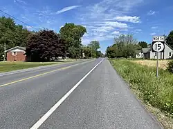 By 1920, the roads that comprise present-day DE 15 existed as county roads.[8] Bunker Hill Road was paved by 1932, with Levels Road being constructed as a state highway by this time.[9] Four years later, the segment between DE 12 and US 13, Brenford Road, a portion north of DE 6, and Bethel Church Road were paved,[10] while Kenton Road was paved three years later.[11] Paving was completed on the sections between DE 14 and Carpenter Bridge Road and from DE 8 to Kenton Road by 1942, and the entire segment between Clayton and Middletown excluding a portion of Blackbird Station Road.[12] The remainder of the road between Milford and Canterbury, the portion between Woodside and DE 10, the portion between Wyoming and Dover, and the segment of Choptank Road between Bohemia Church Road and Bethel Church Road were all paved by 1952.[13] The remainder of the route between Clayton and Middletown was paved two years later.[14] By 1957, paving was completed on the remainder of Choptank Road.[15] The section between Woodside and Wyoming was fully paved by 1959.[16] The Mt. Friendship Road part of the current route was paved by 1964.[17] Two years later, the paving of present-day DE 15 was completed when Alley Corner Road was paved.[18]