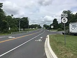 Delaware Route 5 Alternate (DE 5 Alt.) is a 3.8-mile-long (6.1 km) alternate route of DE 5 that bypasses the town of Milton. The route travels west from DE 5 south of Milton along two-lane undivided Sand Hill Road through areas of farms and woods with some homes. The route turns north to join DE 30 on Gravel Hill Road, crossing an abandoned railroad grade just east of the terminus of the Delmarva Central Railroad's Milton Industrial Track line. DE 5 Alt. splits from DE 30 by turning east onto DE 16, following that route through more rural areas on Milton Ellendale Highway. The route ends at an intersection with DE 5 north of Milton. In some locations, the route is signed as "DE 5 Truck Alt."[3][15] The section of the route concurrent with DE 16 is designated as part of the Delaware Bayshore Byway, a Delaware Byway and National Scenic Byway.[6][7]