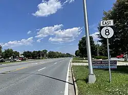 Delaware Route 8 (DE 8) is a state highway located in Kent County in the U.S. state of Delaware. It runs from Maryland Route 454 (MD 454) at the Maryland border in Marydel east to an intersection with DE 9 in Little Creek. The route passes through rural areas of western Kent County before heading through Delaware's capital city, Dover, on Forrest Avenue and Division Street. East of Dover, the road passes through more rural areas. DE 8 intersects DE 44 in Pearsons Corner; DE 15, U.S. Route 13 Alternate (US 13 Alt.), and US 13 in Dover; and the DE 1 toll road at a partial interchange east of Dover. The road was built as a state highway west of Dover by 1924 and east of Dover by 1931. The DE 8 designation was given to the road by 1936.