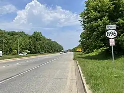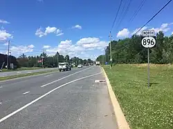 Delaware Route 896 (DE 896) is a state highway located in New Castle County, Delaware. The route runs from U.S. Route 13 (US 13) in Boyds Corner north to the Maryland border northwest of Newark, where the road becomes unsigned Maryland Route 896 (MD 896) briefly before heading into Pennsylvania as Pennsylvania Route 896 (PA 896). The route heads west from US 13 before turning north along with DE 71 in Mount Pleasant, crossing the Chesapeake & Delaware Canal on the Summit Bridge. After the bridge, DE 71 splits off to the east and the road continues to Glasgow, where it comes to an intersection with US 40. DE 896 continues north and interchange with Interstate 95 (I-95) before reaching Newark, where it bypasses the University of Delaware to the west by following DE 4, Elkton Road, and South Main Street. DE 896 comes to downtown Newark and continues northwest to the Maryland border. DE 896 has a business route, DE 896 Business (DE 896 Bus.), that passes through Glasgow, and had an alternate alignment south of Glasgow called DE 896 Alternate (DE 896 Alt.).