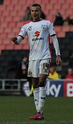 On 11 March 2014, against Notts County at Meadow Lane, aged 17 years and 11 months old, Alli scored a hat-trick to guide the Dons to a 3–1 victory.[14] His next and final goal of the 2013–14 season, came on 5 April against Coventry City at the Sixfields Stadium; Alli struck a volley from 25 yards out as MK Dons defeated Coventry 2–1.[15] He made 37 appearances in all competitions during the 2013–14 season, scoring seven times, with 33 appearances and six goals in the league.