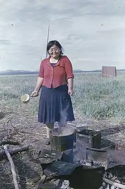 Della Keats' autobiography skips from her early years, 1907-1918, to her adult life, 1930s-1940s.[1] According to the editors of her autobiography, she had married a reindeer herder when she was 16 but was the sole parent and provider of three children in her 20s—Perry, Priscilla, and Sylvester—who ranged in age from 3-9 in 1943. She worked as the Postmaster at Noatak Village to support her children. She also made a living by selling things she sewed and by actively participating in subsistence harvesting with her larger family group. Her parents would travel up and down the Noatak River, and she eventually moved in to help them in 1945.
