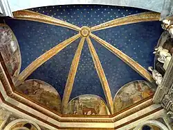 The vault was decorated with delicate all'antica motifs before being covered with a blue carpet and gold stars due to its bad state. There are five frescoes in the lunettes from the Life of St. Jerome, detached and transferred to canvas in the 18th century. The scenes are: