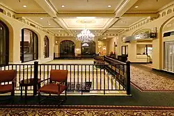Châteauesque features found on the hotel include oriel windows, rounded turrets, quoins, string courses, and machicolations on the hotel's walls.[7] The roof of the hotel features Gothic Revival dormers with carved tympana are spread throughout.[7] A variety of different grotesque are also spread throughout the building.[8] Materials used in construction were of Canadian origin, including Tyndall stone from Manitoba, brick from the Claybank Brick Plant in Claybank, Saskatchewan, and tiles from Estevan, Saskatchewan.[9] The interior of the hotel features ceiling moulds, plaster reliefs, and terrazzo floors.