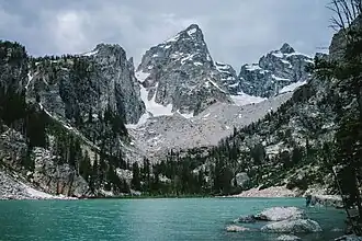 Delta Lake is located in Grand Teton National Park, in the U.S. state of Wyoming.[2] Delta Lake is situated in Glacier Gulch and is fed rock flour (glacial silt) from the Teton Glacier, which turns the water turquoise in appearance. It has been an increasingly popular hiking destination in the park, with the number of hikers increasing 164% from 2016 to 2018.[3] The easiest walk to the lake is by way of the a hike commencing from the Lupine Meadows trailhead. Following the trail to Surprise and Amphitheater Lakes and an off trail effort to the north from Surprise Lake provides access to Delta Lake.[4] The effort is considered strenuous for even getting to Surprise Lake is nearly a ten mile roundtrip with over 3,000 feet (910 m) of elevation gain.[5] Below Delta Lake lies Glacier Falls, an intermittent 300-foot (91 m) waterfall.