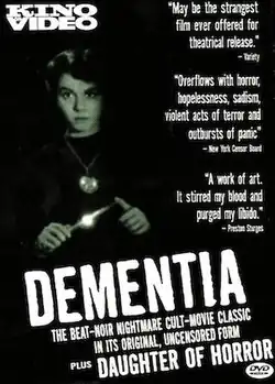 Dementia is a 1955 American black-and-white experimental horror film produced, written, and directed by John Parker, and starring Adrienne Barrett and Bruno Ve Sota. The film, which contains no dialogue,[4] follows a young woman's nightmarish experiences during a single night in Los Angeles's skid row. Stylistically, it incorporates elements of horror, film noir, and expressionist film.[5]