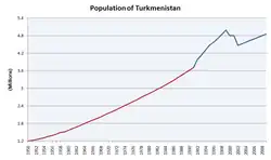 The 17 January 1939 census showed a population of 1,251,883, of which 741.5 thousand Turkmen, 232.9 thousand Russians, 107.4 thousand Uzbeks, 61.4 thousand Kazakhs, 19.5 thousand Tatars, 8,300 Iranians, 5,400 Baloch, and 75.5 thousand other nationalities.[2] The population of Turkmenistan increased from 1.5 million in the 1959 census to 4.5 million in the 1995 census.[3] The population continued growing to over 5 million in 2001–2006.[4] According to opposition media, Turkmenistan's population in 2019 was no more than 3.3 million.[5] As of July 2021, anonymous official sources informed opposition news media that the population of Turkmenistan had fallen to between 2.7 and 2.8 million.[6]