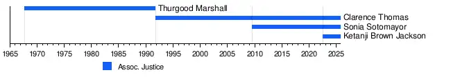 All Supreme Court justices were white and of mostly Northwestern European heritage until the appointment of Thurgood Marshall, the first African-American Justice, in 1967. Since then, only three other non-white justices have been appointed: Marshall's African-American successor, Clarence Thomas, in 1991, Latina Justice Sonia Sotomayor in 2009, and African-American Ketanji Brown Jackson in 2022.[23]