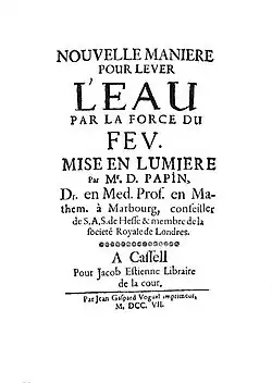- Nouvelle manière pour lever l'eau par la force du feu ... par m. D. Papin. A Cassel: pour Jacob Estienne libraire de la cour : par Jean Gaspard Voguel imprimeur. 1707.