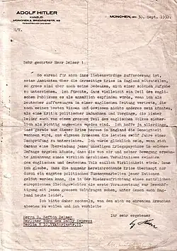 Cordial letter from Hitler to Delmer, 30 September 1931, commenting on "crisis" in England
