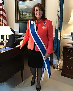 VanBuren was installed as the 45th DAR President General in 2019 during the 128th Continental Congress and continued in that role until 2022. She chose the theme "Rise and Shine for America" with the goals of "passionate purpose, increased membership and an improved public image."[6] During her term the DAR held its first virtual Continental Congress on account of the COVID-19 pandemic.[7] In addition, she released the DAR's Continuing Commitment to Equality, in which the DAR "reaffirm[ed] to the membership and the public alike that our organization condemns racism." and stated that "Bias, prejudice and intolerance have no place in the DAR or America."[8] In 2022, she placed a historic marker at the grave of Eunice Davis, a multiracial woman and daughter of an American Revolutionary patriot who joined the DAR in 1896.[9]