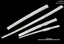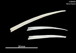 Dentaliida is one of the two orders of scaphopod mollusks,[2] commonly known as elephant's tusk shells. The order Dentaliida contains most of the larger scaphopods, and is distinguished from the other order (the Gadilidae) by the shape of its shell (the dentaliid shell tapers uniformly from anterior to posterior; the gadilid one has an anterior shell opening slightly smaller than the shell's widest point), the shape of the foot (the dentaliid foot is boat-shaped with a central trough; the gadilid foot is star-shaped), and the arrangement of some of their internal organs.