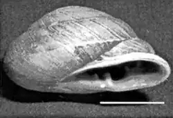 | Black-and-white photo: an apertural view of a shell of Dentellaria sloaneana from Jamaica. Scale bar = 1 cm. | |