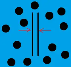 In the first case, two solid plates are placed in a solution of rigid spherical macromolecules.[5] If the distance between two plates, , is smaller than the diameter of solute molecules, , then no solute can enter between the plates. This results in pure solvent existing between the plates. The difference in concentration of macromolecules in the solution between the plates and the bulk solution causes a force equal to the osmotic pressure to act on the plates. In a very dilute and monodisperse solution the force is defined by