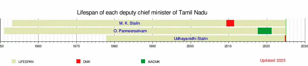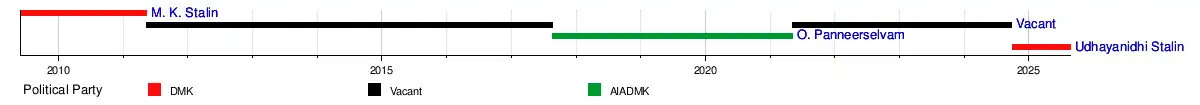 The office has since been only intermittently occupied, having been occupied for a little more than 6 years out of the 16 years since its inauguration. Since 2009, Tamil Nadu has had 3 deputy chief ministers; none of them have served at least one full term. The position was first occupied by the former chief minister of Tamil Nadu M. Karunanidhi's third son, M. K. Stalin of the Dravida Munnetra Kazhagam, who was sworn in on 29 May 2009; he was also rural development and local administration minister in Karunanidhi's fifth ministry.[3] The position was vacant until All India Anna Dravida Munnetra Kazhagam's O. Panneerselvam took over; he became the second deputy chief minister on 21 August 2017 and took on the role in addition to his finance ministership in Edappadi K. Palaniswami's ministry.[4] The position was thirdly occupied by the chief minister of Tamil Nadu M. K. Stalin's son, Udhayanidhi Stalin of the Dravida Munnetra Kazhagam, who was appointed on 28 September 2024; he is also the youth welfare and sports development minister in Stalin's ministry.[5]
