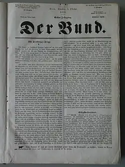 The newspaper was founded by Franz Louis Jent, a bookseller from Solothurn and veteran of the Freischarenzüge – the Liberal insurrections of 1844–45 that led to the 1847 Sonderbund War, a Swiss civil war.[5] The newspaper's name, Der Bund, translates as "The Union", but is also shorthand for the Swiss Confederation, the democratic federal state established in 1848 by the Liberal victors of the civil war.