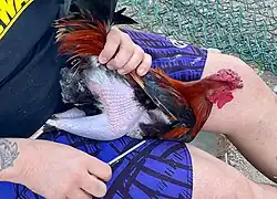 In the traditional Dera Gai ritual, a hole is dug, and a rooster is placed inside with only its head protruding often covered with a green or dried Calabash gourd. The rooster symbolizes the betrayal of Jesus Christ by Judas.[4] Participants, blindfolded, attempt to hit rooster encouraged by music and singing.[2] The festivals include symbolic attire with females wearing yellow outfits representing the kibrahacha flower (Tabebuia billbergii), and males donning black trousers, white shirts, and a yellow tie.[5][3]