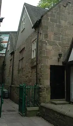 This re-founding by Royal Charter of the new Free Grammar School was established in a purpose-built building, now called the Old Grammar School, next to St Peter's Church.[7] In the late 20th century, this building was for some time part of the Derby Heritage Centre and is now a ladies' hairdresser's. The school remained at this site until around 1860 it moved temporarily to a property occupied by the then Headmaster, Dr. Thomas Humphreys Leary, in Friargate. Research is being undertaken in December 2016 to determine the property concerned. Due to the generosity of Edward Strutt, then the owner who had his property up for sale the school was allowed to move into St Helen's House in King Street, Derby in 1861 for a period of two years rent free.[8] The school held a closed exhibition (a form of scholarship) worth £50 a year at Emmanuel College, Cambridge.[9] At any one time, this could be held by one old boy of the school, who had the title at Emmanuel College of Exhibitioner. (Until the 1930s, £50 was a substantial sum, usually more than the annual wage of a farm labourer.)
