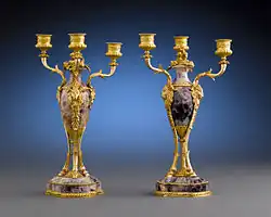 The most common explanation for the name is that it derives from the French bleu-jaune, meaning 'blue-yellow'. The story goes that Blue John was exported to France where it was used by ormolu workers during the reign of Louis XVI (1774–92). However, there is no archival record of any Blue John being exported to France,[1]: 7 and the early ormolu ornaments which use Blue John were being manufactured by Matthew Boulton of Birmingham in the 1760s.