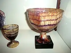 Roman writers, such as Pliny the Elder, refer to a soft ornamental rock which they called murrhine, out of which drinking vessels were carved.[1]: 53 Pliny describes the mineral as having a "great variety of colours" with "shades of purple and white with a mixture of the two".[1]: 53 Whether this mineral was banded fluorite is uncertain, but it was apparently soft enough (like fluorite) to allow one particular man of consular rank to gnaw at the edges of his cup.[1]: 54 There is no reason to suppose the mineral came from Britain – Pliny and other writers specifically state that the mineral came from Persia.[1]: 54 It is sometimes claimed that Blue John vases were found during excavations at Pompeii,[5] but these vases are in fact made from banded amethystine quartz.[1]: 53 However, two cups have been found among Roman grave-goods near the Turkish/Syrian border, on the former Persian-Roman trade route, which were made from blue-yellow banded fluorspar presumably obtained from the Persian source mentioned by Pliny.[1]: 55 Both cups, known as the Crawford Cup and the Barber Cup, are in the British Museum.[6][7]