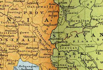The Derlingau approximately consisted of the area between the river Oker in the west and the Lappwald forest in the east. It was bordered by (from the north, clockwise): Bardengau, Gau Osterwald, Nordthüringgau, Harzgau, Salzgau, Hastfalagau, Gau Flutwide, Gau Gretinge.[1] The most important town was Evessen, and later Brunswick. The Derlingau belonged to the diocese of the Bishop of Halberstadt.