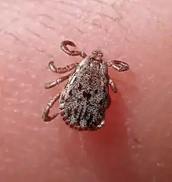 Dermacentor occidentalis, also known as the Pacific coast tick, is a species of wood tick in the arthropod family Ixodidae.[1] This species is part of the coastal California biome.[2][1] Host species include humans.[2] When not engorged with blood, they measure about 4.5 millimeters long.[2] The exoskeleton is a silvery-gray color.[2]