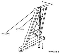 A shearleg derrick is similar to a breast derrick with the exception that, instead of fixed guy wires that secure the top of the mast, it is secured by multiple reeved guys to permit handling loads at various radii by means of load tackle pulley system suspended from the mast top.[2] In a simpler construction, a shearleg derrick can be assembled from two posts to form A-frame shear legs without any crossbar. The bottom of the legs are set in two holes on the ground, spreading them apart. There is a rope to tie the two legs together near the bottom to prevent them from spreading apart further. On the top side, the two legs are connected together by a lashing but with a small spacer block placed between the legs. A sling, which may be made from ropes, is placed around the area that two legs meet to be used to put a tackle pulley system for lifting the load. There are two guy wires, front and rear, to support the shear legs. The rear guy may be reeved to allow adjustment of the angle of the shear legs.[7]