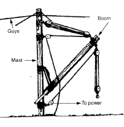 A gin pole derrick (also known as standing derrick or pole derrick) is a derrick without a boom and with single tower or mast supported by four guy wires (two side guys, a fore guy and a rear guy). Its guys are so arranged from its top as to permit leaning the mast in any direction. The base of the tower is hinged and the top of the tower is connected to a pulley system for load lifting. As this is a simple derrick system, it is recommended for use by some agencies as an improvised rescue derrick in an emergency situation where no suitable rescue derrick or crane is available.[1][2]