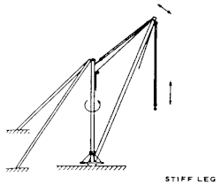 A stiffleg derrick, also known as a Scotch derrick, is a derrick with a boom similar to that of a guy derrick, but instead of using guy wires to secure the top of the mast, it uses two or more stiff members, called stifflegs, which are capable of resisting either tensile or compressive forces. Sills may also be used to connect between the bottom ends of the stifflegs and the base of the mast.[2] There may be a counterweight to place on the sills behind the stifflegs in heavy load lifting.[7] A stiffleg derrick on a vessel is called a floating stiffleg derrick.[4]