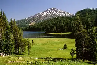 Recreational activities in the forest include boating, fishing, wildlife watching, and hiking, as well as mountain biking (with an extensive trail system).[19] Hiking and skiing can be done on Mount Bachelor, a stratovolcano in the Cascade Range.