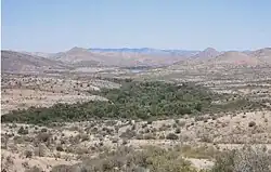 Desert riparian is a North American desert vegetation type (or biome) occurring in the bottoms of valleys, canyons, and other watercourses that have water at or near the surface most of the year.[1] The visual character is of large, lush, perennial green trees surrounded by dry desert vegetation and soil coloration.[1] The area may be in a patch surrounding a spring such as an oasis, or in a strand following the course of water flow, such as a bosque.[1] The soil in this biome is typically moist and ranges from rocky and sandy to silty alluvium.[2] This biome has seasonal variation, with hot, dry summers and cool, moist winters.[2] Precipitation mostly occurs during the winter, and ranges from 8 to 25 cm each year.[2] It is contrasted with the desert dry wash vegetation type, in which water at or near the surface is lacking most of the year, such as arroyos.[1]