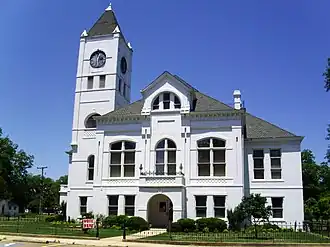 The Desha County Courthouse, on Robert S. Moore Avenue in Arkansas City, Arkansas, is the county seat of Desha County. The 2+1⁄2-story Romanesque Revival brick building was built in 1900 to a design by Little Rock architect Rome Harding. Its most distinctive feature is its four-story square tower, which features doubled rectangular windows on the first level, a round-arch window on the second, an open round arch on the third, and clock faces on the fourth level. The tower is topped by a pyramidal roof with finial.[2]