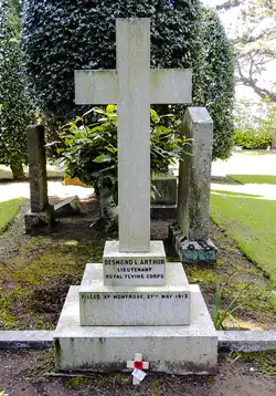 On 18 June 1912 Arthur gained his Royal Aero Club certificate No.233 after completing his trials flying a Bristol Prier monoplane at Brooklands. He joined No. 2 Squadron of the Royal Flying Corps on 17 April 1913, based at Montrose. In 1913, Montrose Airfield was built as an operational base for the training of pilots for the Royal Flying Corps, the first of its kind in Britain.[8] The flying training school, like many others, experienced frequent crashes as it built up a force of skilled pilots through the First and Second World Wars.[9] At around 7:30am on Tuesday 27 May 1913 Arthur's B.E.2 biplane No.205 collapsed without warning while flying over Montrose during a routine training flight from Upper Dysart to Lunan Bay.[2] Arthur had begun to descend when, at 2,500 feet (760 m), the right wing of the aircraft snapped off and it plunged to the ground.[10] Arthur was thrown from the aircraft and died instantly.[2][11] He was found 160 yards (150 m) away from his machine.[6] Arthur's death in an accident was one of the first to occur in the Royal Flying Corps, and the first at Montrose.[12] He was buried in Sleepyhillock Cemetery, Montrose.[13]