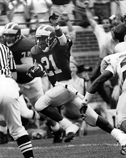 Ohio State coach John Cooper ordered his team to avoid giving Howard chances to score. The punt that Howard returned for a touchdown in the game was supposed to go out of bounds, so the Ohio State special teams players were unprepared for him.[8] In the end zone, Howard wanted to do a backflip but, Howard later said, "chickened out"; instead he imitated the pose of the football player on the Heisman trophy bust, immediately receiving much media attention. Comparing his act to Muhammad Ali's taunting of opponents, Steve Rushin observed that although Howard's pose did not closely resemble that of the statue, "that looks more like the Heisman Trophy of our imagination than the Heisman trophy itself ... thousands of people must have instantly picked up some object and tried to do the same thing". Howard later said that "all of a sudden, everyone was doing it"; many have imitated the act, including fellow athletes, celebrities, and Presidents George W. Bush and Barack Obama.[9] Howard said that the pose has become a greeting for fans meeting him, but he avoids doing it himself "because the more I do it, it kind of cheapens it".[8]
