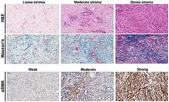 Micrographs of loose, moderate and dense desmoplastic stroma in pancreatic ductal adenocarcinoma, as seen with H&E stain (top row), Masson's trichrome stain (middle row) and α-smooth muscle actin.