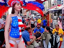 A desnuda is a seminude, topless female performer covered in body paint who poses for photos in exchange for tips in the pedestrian plaza of New York City's Times Square. The desnudas typically wear thong underwear and high heels, and use red, white, and blue body paint to emulate the colors of the American flag. The performers are primarily Latina. In Spanish, desnuda means naked.[1]