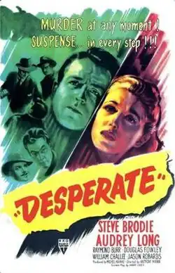 Desperate is a 1947 suspense film noir directed by Anthony Mann and featuring Steve Brodie, Audrey Long, Raymond Burr, Douglas Fowley, William Challee and Jason Robards.[2]