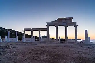Although presently uninhabited, there are significant indications that in prehistoric and ancient times the island - due to its central position among the Cyclades and the large Despotiko Bay (between the island and Antiparos) providing safe anchorage[7] - played an important role in maritime communication routes.[8] Currently, excavations are taking place in the northwest part of the island and so far the findings are of great importance. The excavations proved the existence of an important late Archaic sanctuary with abundant objects indicating links to mainland Greece, the Eastern Mediterranean and even to Northern Africa, as well as the continued use of this area in the Classical, Hellenistic, Roman and Frankish periods.[6][9] The islet was visited in early 1884 by the English explorer Theodore Bent who made a brief survey and located two 'graveyards'.[10] Mabel Bent records in her diary at the time that her husband discovered a temple there.[11] 2015 excavations at the Archaic (6th C BC) sanctuary site on an Aegean Sea islet revealed new evidence about its size and organization. The sanctuary seems to have been devoted to Apollo. Archaeologists discovered an ornate façade of a structure measuring 35 meters by 15 meters, suggesting that the sanctuary was extended and rebuilt several times during the Classical and Hellenistic periods. A large, four-room building on the site's west section featured a large stone altar in one of the rooms as well as pottery fragments bearing inscriptions with Apollo's name. A long wall, stretching from what would have been the islet's ancient port to the site of the sanctuary, was also revealed.[12] Some of the artefacts from the excavations are exhibited in the archaeological museum in Parikia, the capital of the nearby island of Paros, along with other important antiquities from the region. Some glimpses of the early modern and modern history of Despotiko might be reconstructed from historic topographic maps[13][14] and descriptions of travellers from that period.[3] The island, under the name Prepesinthus, is also noted by ancient geographers Strabo[15] and Pliny the Elder.[16]