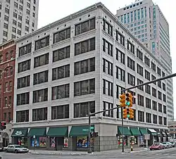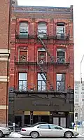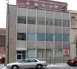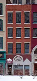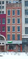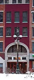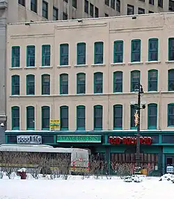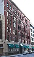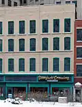 The Traub Brothers Jewelry Building is a four-story wood-frame brick building, built in 1879. Presumably the first floor was used as retail while the upper floors were used as residential space.[27] The building was purchased by Grand Trunk Railroad early in the 20th century, and in 1911 it was renovated to serve as their ticketing office.[2] Grand Trunk removed the second floor and installed a vaulted ceiling reminiscent of period railroad stations.[27] The renovation added a rounded arch on the second floor, filled with paned windows and surrounded by terra cotta detailing with the company's logo.[27] The finely detailed interior woodwork also includes company logos.[27] Although the lower floors of the building were completely altered during this renovation, the upper two floors still retain the original window shapes.[2]