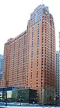 The One Woodward Avenue Building (Michigan Consolidated Gas Company Building) is a 32-story, flat-roofed skyscraper with a steel frame. It was built in 1960–62, and designed by Minoru Yamasaki and Smith, Hinchman, and Grylls; the building was apparently a model for Yamasaki's later work of the World Trade Center in New York.[20] The building rests on a platform, approached via entrance staircases, with a reflecting pool and tall glass-enclosed lobby emphasizing the airy lightness.[21] White concrete panels hold the hexagonal windows in place.[2] The three-story glass panels were the tallest ever installed at the time.[21]