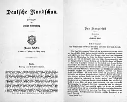 Deutsche Rundschau was a literary and political periodical established in 1874 by Julius Rodenberg.[1] It strongly influenced German politics, literature and culture was considered one of the most successful launches of periodicals in Germany. Among its authors were Theodor Fontane (Effi Briest), Paul Heyse, Theodor Storm (The Dykemaster),[2] Gottfried Keller and Ernst Robert Curtius. Richard Moritz Meyer, a German literature historian, described Deutsche Rundschau as the printed university.[1] It was circulated, with interruptions during the Nazi era, until 1964.[3]