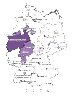 There are more than 30 subsidies, most granted by municipalities, for low-income people. Most discounts are granted to welfare recipients and asylum seekers, but the criteria differ. 28 local authorities offer a subsidised Deutschlandticket, ranging from 15 Euros (Würzburg) to 53 Euros (Magdeburg). The federal states of Hamburg, Hesse, and Northrine-Westphalia also offer a discount. In addition, there are more than 200 local and regional welfare tickets throughout Germany.[16] Furthermore, students and employees whose employers have a contract with their local public transport company pay lower prices for the Deutschlandticket.[17]