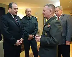 Nonetheless, Devi Chankotadze implemented a series of reforms[12] aimed at integration Georgia's armed forces to NATO standards.[13] For that matter, he led a series of domestic and international military exercises, including the national Shield 2009[14] and Cooperative-Longbow 2009.[15] He also opened a new military base in the country, while seeking to boost international cooperation, especially with Poland,[16] Estonia,[17] Germany[18] and the United States, seeking cooperation in military education with the latter states. In March 2012, he invited his Armenian counterpart, Colonel General Yuri Khatchaturov to visit Georgia.[19]