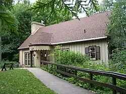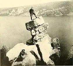 The park was founded in 1911.[9] It was home to five resorts, two of which were perched on the west bluff. Few traces of these structures remain, though footings and foundational structures can be found along the South shore and near Prospect Point on the West Bluff. There were also many private residences in the west and south shores of the lake, only four of which remain.[10] At various times the lakeshore hosted water slides, lodges, ferry boat launches and golf courses. The clubhouse of one course sat on the current location of the park's nature center. By the 1940s, the hotels were all closed, and the park was retreating to its former natural self.