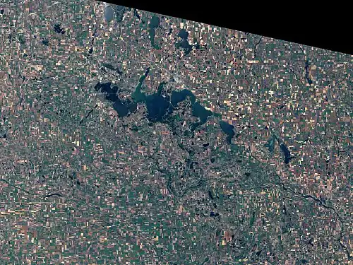 Devils Lake is the endorheic, or closed, lake of a drainage basin of some 3,800 sq mi (9,800 km2), the Devils Lake Basin. The lake collects around 86 percent of the basin's water runoff.[9] Above an elevation of 1,447 ft (441 m) AMSL, the lake spills into neighboring Stump Lake. At 1,458 ft (444 m), the combined lake flows naturally into the Sheyenne River, though the lake has not reached this level in approximately 1,000 years.[10] The Sheyenne River is a tributary to the Red River, which flows into Canada, with eventual exit into the Hudson Bay.[9] Dike protection is set at 1,454 ft (443 m).