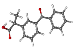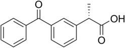 Dexketoprofen is the (S)-enantiomer of ketoprofen. Technically it is a chiral switch of (±)-ketoprofen. The switch was done for a faster onset of action, a better therapeutic value.[3] Dexketoprofen consists of a propionic acid moiety connected to a benzophenone molecule by its second carbon.