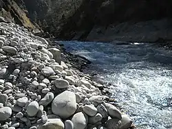 Dhauliganga rises in the vicinity of the Niti Pass in the border regions between Garhwal and southwestern Tibet.[1] It flows 50 km (30 mi) southwards until it meets the Rishiganga on its left bank at Rini, in the vicinity of Tapovan in Chamoli district. It then flows 20 km (10 mi) westwards until it meets the Alaknanda at Vishnuprayag and terminates—the confluence just upstream of the city of Joshimath.[1] The upper Dhauliganga valley parts the East-West Himalayan axis, with Nanda Devi and its subsidiary peaks to its left and Kamet and its subsidiary peaks to its right.[1]